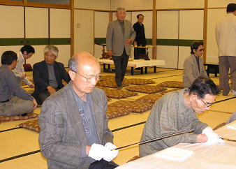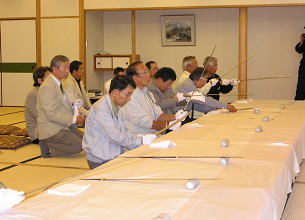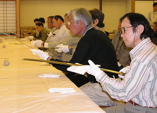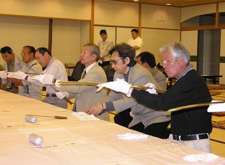 天位 谷 茂信 人位 丹生 寿男 地位 大塚 勝士、大戸井 美生また、今回の鑑賞刀のねらいとして、肥前刀の上三代を勉強することとした結果、初代忠吉の薙刀、刀、二代の忠広の刀、三代陸奥守忠吉の刀が勢揃いしました。会員は各代それぞれの特徴・持味を堪能し、満足したようでした。