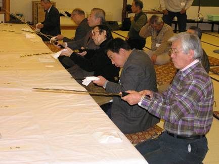 鑑賞会は昨年9月兵庫県支部で行われていた会員ネームプレート着用、鑑定刀の特製柄巻き使用、ベルでの時間を設定しての鑑定を見習って実施したい旨の説明後開会されました。ベルの音に従って、回転の利いた鑑賞が進んだ結果、これまでにない多くの会員が入札に参加し盛況となりました。