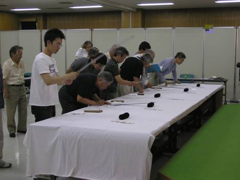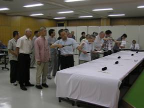 岡山県支部長の挨拶のあと、鑑賞会が始まりました。30名以上の会員はお目当ての刀の前に整然と並び鑑賞されました。
