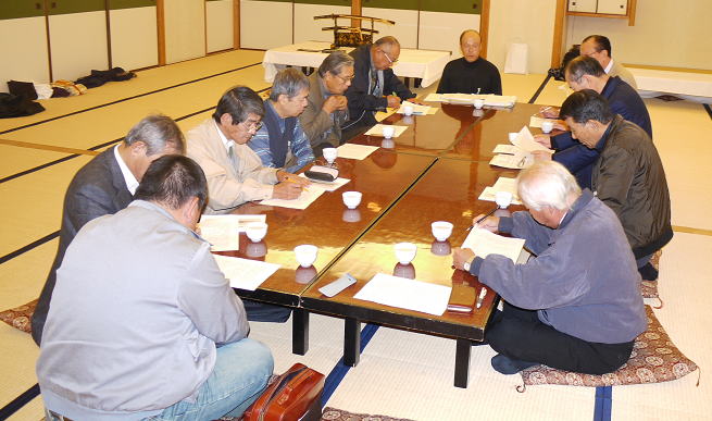 当支部では本部が公益財団法人となった機会をとらえ、初めての試みとして会員所蔵刀及び小道具の鑑賞会を11月18日高松テルサで開催しました。出席者は十一名とこじんまりとしていましたが、持参された刀剣は十口、小道具は大小拵、半太刀拵と充実していました。鑑賞会に先立ち、福本支部長が挨拶し、新規会員の増強を図る意味からこれまでややもすると鑑定主体であった鑑賞会から初心者も楽しめるよう鑑賞を主眼に置いた会にしていきたいとの説明があった。その後、初心者講座、誌上鑑定の検討を行い、昼食の懇談後、所蔵刀、小道具の鑑賞会を開催した。