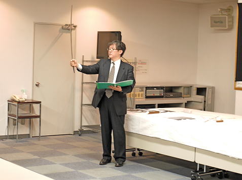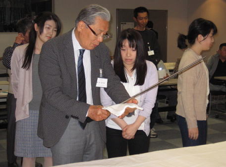 昼食後、鑑賞会に入る前に刀剣の取扱を川辺勝一、相談役が講師で新入会員に指導にあたりました。