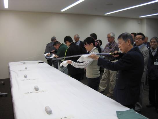 鑑定に挑戦する会員 古刀とは聞いているが、何処の誰だろうかなぁ? 入札鑑定後に講師の石井先生から解説がありました。保弘を手に解説する講師