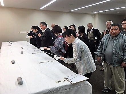 食事休憩後、午後1時より前回の三星の賞品を授与し、村中支部長の挨拶と小池支部長ご持参のお刀のヒントをいただき、参加者四国讃岐支部16名、岡山県支部9名での三本入札に入りました。
