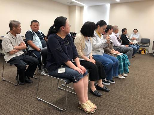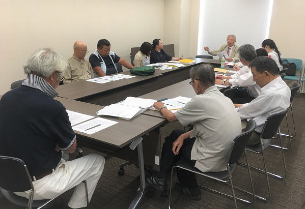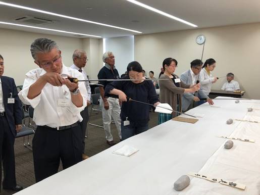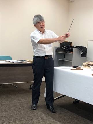 三号刀は延徳年記(1489年頃)の勝光の脇差でした。 反りが強く、重ねの厚く、鮮明な映りが出ている作品でした。 四号刀は室町時代末期の天正(1573年頃)の刀でした ずっしりと重く感じ、沸(にえ)づいて乱れた波文、映りの立った作品でした。 五号刀は江戸時代初期寛永年代(1630年頃)の刀でした。 沸の大きな粒が顕著でした。 世によく知られている大与五国重(おおよごくにしげ)との解説でした。 入札は三本で行われ、成績上位者の三星は次の方々となりました。 天位 東畑廣義 地位 大塚勝士 人位 丹生寿男、綾田美奈子 なお、当支部は9月29日に中国・四国ブロック大会を開催いたします。 多くの刀剣愛好家の参加をお待ちするとともに、支部長指示のもと会員一同、大会が成功裏に閉幕できますよう力を合わせて準備しております。