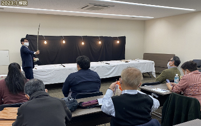 梅が咲きはじめ春の日差しが感じられるも、肌寒い曇り空のもと、1月22日(日)大西・アオイ記念館にて、感染リスクを考え、午後から鑑賞鑑定会のみの開催となりました。今回は、協会より武田耕太郎講師をお迎えし、支部会員と入会希望者を含めて17名の方が出席されました。