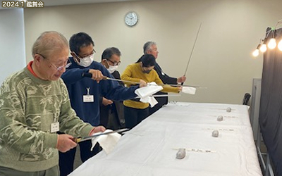 入札後の解説においても、支部会員から質問が多く飛び交いました。作刀の前期と後期で刃中の働きが異なる刀工や、2名の刀工の合作の話については、弊支部会において、以前、同時代の大阪新刀を複数本並べて見比べたこともあり、是非とも同時に見比べてみたいものだと思いました。