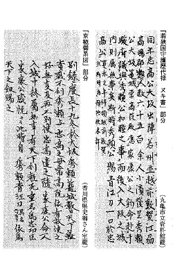 平成22年秋、丸亀市立資料館学芸員の大北知美様から、ニッカリ青江に関する資料が2点あることを教えて頂きました。 そのひとつは、文化8年の奥書がある「若狭国守護歴代禄ヌキ書」(丸亀市立資料館蔵)であり、 もうひとつは、幕末に多度津京極家、家臣富井泰蔵が写した富井家文章の中の「京極御系図」であります。 この文章二点を、香川県立ミュージアム学芸員の御厨義道様に読み下していただきました。