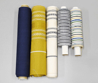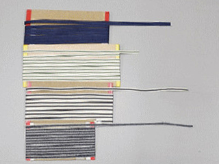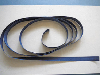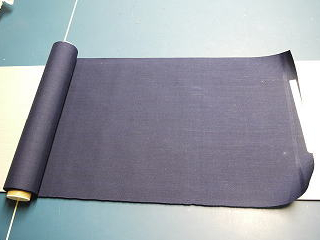 両面融着テープ、他に、のり、布ボンドでも良い、その場合はアイロンで加工された後から接着すると良と思います。 小倉織を柄糸に使用できる物は羽織、帯、学生服、のような少し厚めの生地が良いと思います、柄(がら)とか色で薄物を使用したい場合は21ミリ幅で裁って三枚重ねで7ミリの幅の紐(柄糸)が出来ます。(柄巻に出来る織物写真4)