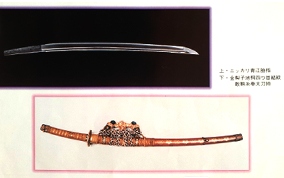ニッカリの本身を拵に入れればはっきりするが「ひけ傷」が付くと大変なのでそれは出来ません。そこで私は刀剣雑誌の付録で入手したニッカリの実物大ポスターを用意しました。そして「ニッカリ青江公開展」の飾り付けを日刀保讃岐支部が協力して行った時に、太刀拵から「ツナギ」を外してポスターの上に置きました。すると刀身は勿論の事、茎の形状も目釘孔の位置も完全に一致しました。文字通り寸分の誤差もありません。これで拵はニッカリの物に間違いないと証明されました。