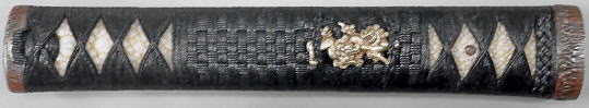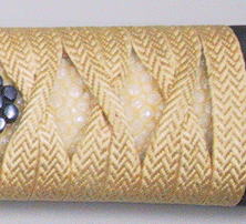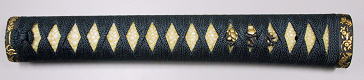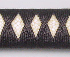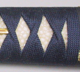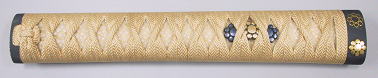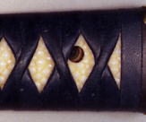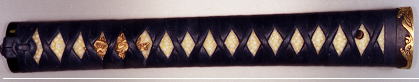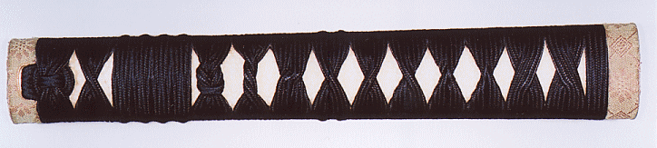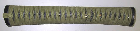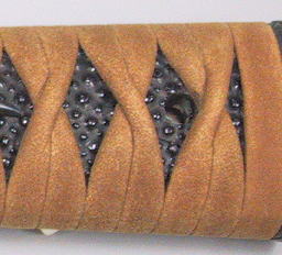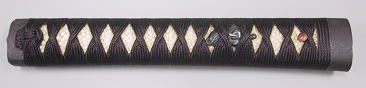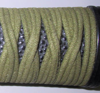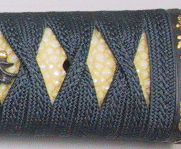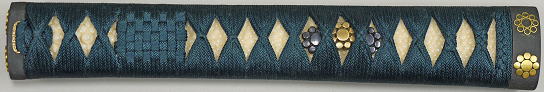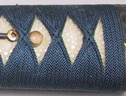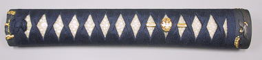 鉄紺色の蛇腹糸で六本糸を諸捻り巻しその上に二本の糸を網代編みに組上げた柄巻きです。