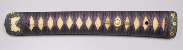 蛇腹糸で古代紫色四本と鉄紺色四本混合で巻始め三菱は葵結びで組上げ中程から二本の糸を網代組上げさらに終わり三菱を葵結びをした変わり巻きした柄巻きです。