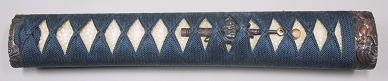 黒塗合口拵(上杉謙信 太刀山鳥毛一文字)写しの柄で古代柄藍革平巻きで裏及び頭に結びを着ける。