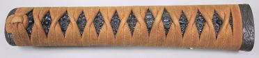 染めた鞣し鹿革の吟面を柳生柄風に諸撮みで巻いた柄巻きで、目貫が指し表頭側に付くのが特徴です。