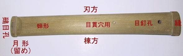 短冊着 (たんざくぎせ) 柄の裏表の面を短冊形にくり貫いてそこえ鮫皮を据え込む方法