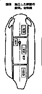 白く晒した鮫皮をささら【細い竹を束にしたもの】又はワイヤブラシで粒と粒の間にある筋を取り去り、取り切れないものは針を用い、一本一本まめに取り除きます。数日かけて袋に入れたイボタで叩き、うずくり【カルカヤの根っこを束ねたもの】で磨き鮫皮の艶を出します.鮫皮を柄に着せるには、裏面の処理が重要で鮫皮の厚みが違うので着せたときに凸凹のないように鋤包丁、砥石を使って平らにする作業があります。このようにして加工された鮫皮は図のように「一の切」、「二の切」と切り分けて柄に張ります。しかし