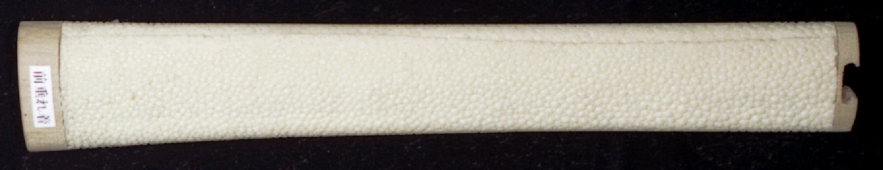 鮫皮(エイ革)を使用するのは柄木の補強、又柄糸のすべり留めのため大事な役目をします。鮫は南シナ海南洋諸島、及び紅海、などで産する【トリコン・セフェン】(Trygon/sephen)というエイの革で(鮫革=エイ革)、鮫類の皮ではい、鮫皮は元来焦げ茶色をしておりますので、これを白く晒します。