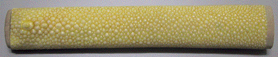 現在では鮫は親粒のある「一の切」しか使用しません。柄の大きさに切った鮫皮は接着剤を付けず仮着せして具合をみます、柄に何度も仮着せをし柄の凸凹に良く馴染ませてから張ります。鮫皮は湿度が高いと延び低いと縮む性格があるので鮫張りには雨降りとか梅雨時期にはさけて張ります。